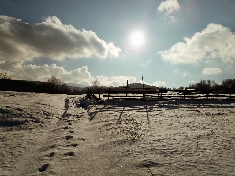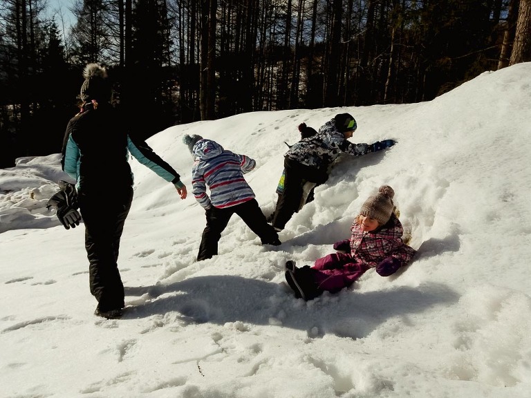 A gdy wybraliśmy się na szlak, który latem pokonaliśmy „na rozgrzewkę”, zaliczyliśmy jeden z najbardziej pamiętliwych spacerów w życiu. Płakaliśmy ze śmiechu, zapadając się non stop w śniegu. Brodziliśmy, zapadaliśmy się głębiej niż po kolana, niektórzy próbowali się czołgać, popychając sanki wiozące najmłodszą uczestniczkę wyprawy. Tego się nie da opisać ale mam nadzieję, że uda się zapamiętać. Taka chwila absolutnego szczęścia. Bo do szczęścia wiele nie potrzeba ale ważna jest odpowiednia perspektywa.
